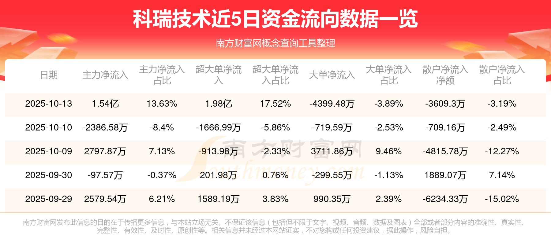 10月13日消息,科瑞技术主力净流入1.54亿元,超大单净流入1.98亿元,散户净流出3609.3万元。