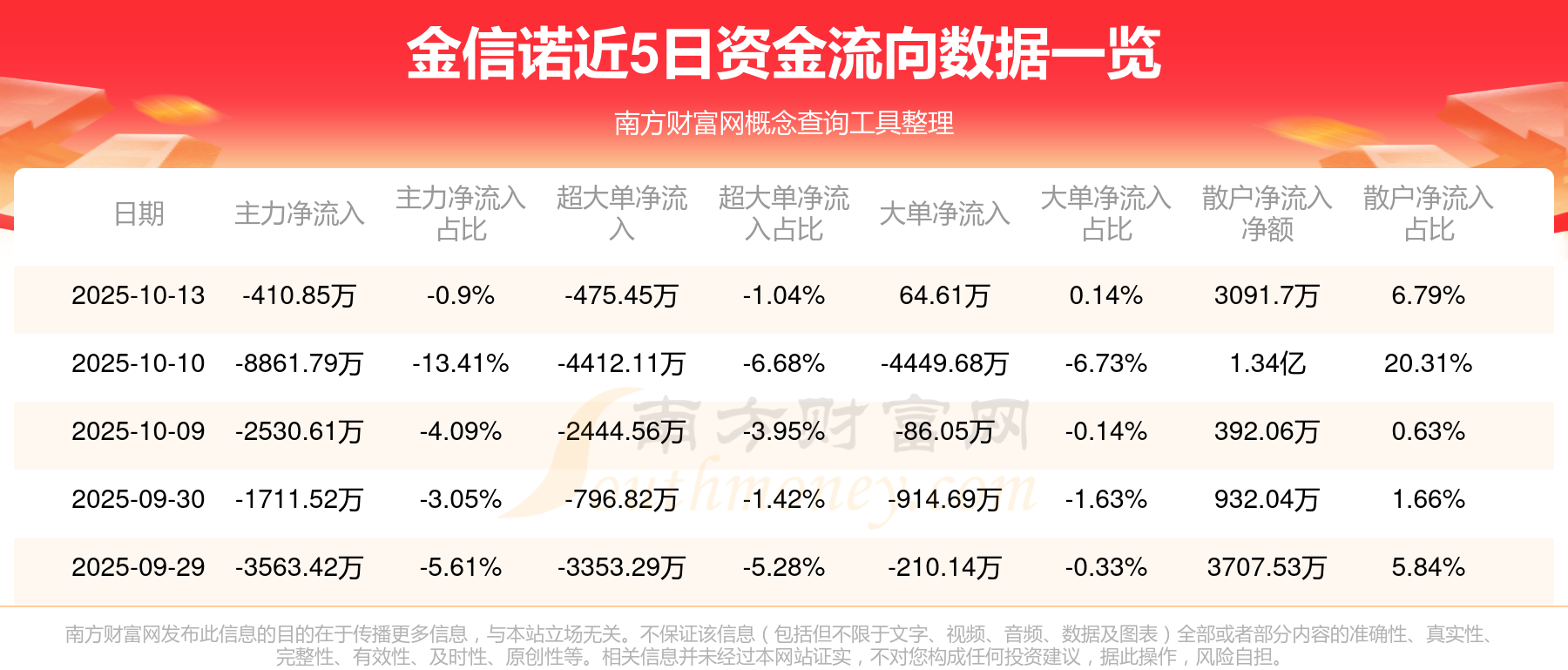 10月13日消息,金信诺10月13日主力净流出410.85万元,超大单净流出475.45万元,大单净流入64.61万元,散户净流入3091.7万元。