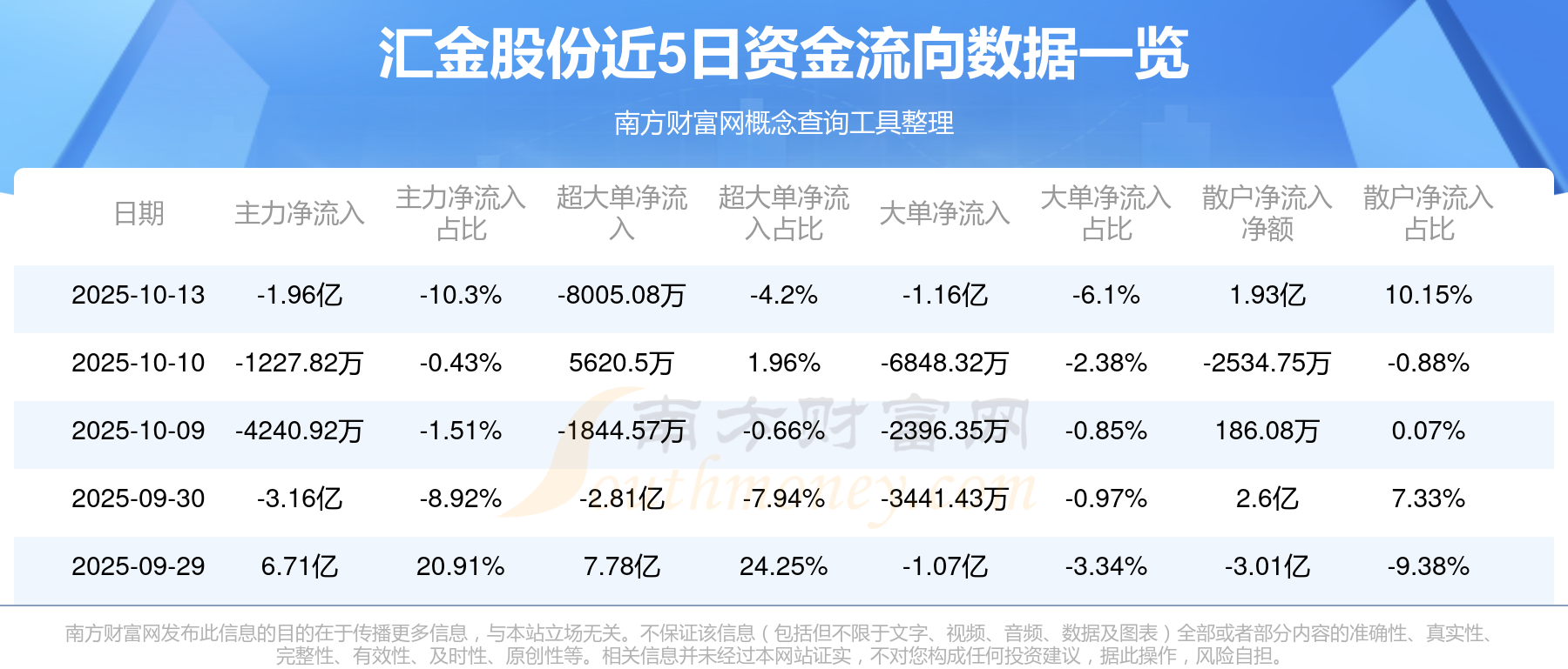 10月13日消息,汇金股份主力净流出1.96亿元,超大单净流出8005.08万元,散户净流入1.93亿元。