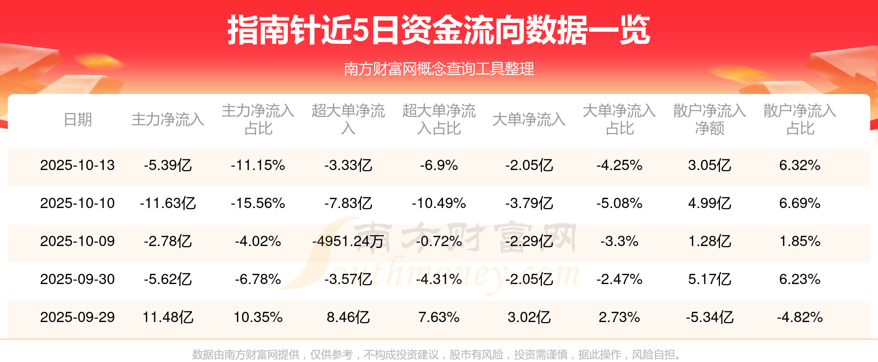 10月13日消息,指南针主力资金净流出5.39亿元,超大单资金净流出3.33亿元,散户资金净流入3.05亿元。