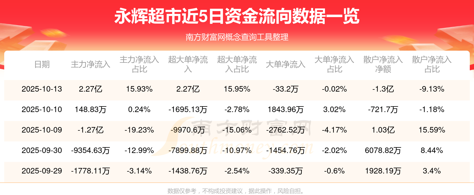 10月13日消息,永辉超市10月13日主力净流入2.27亿元,超大单净流入2.27亿元,大单净流出33.2万元,散户净流出1.3亿元。