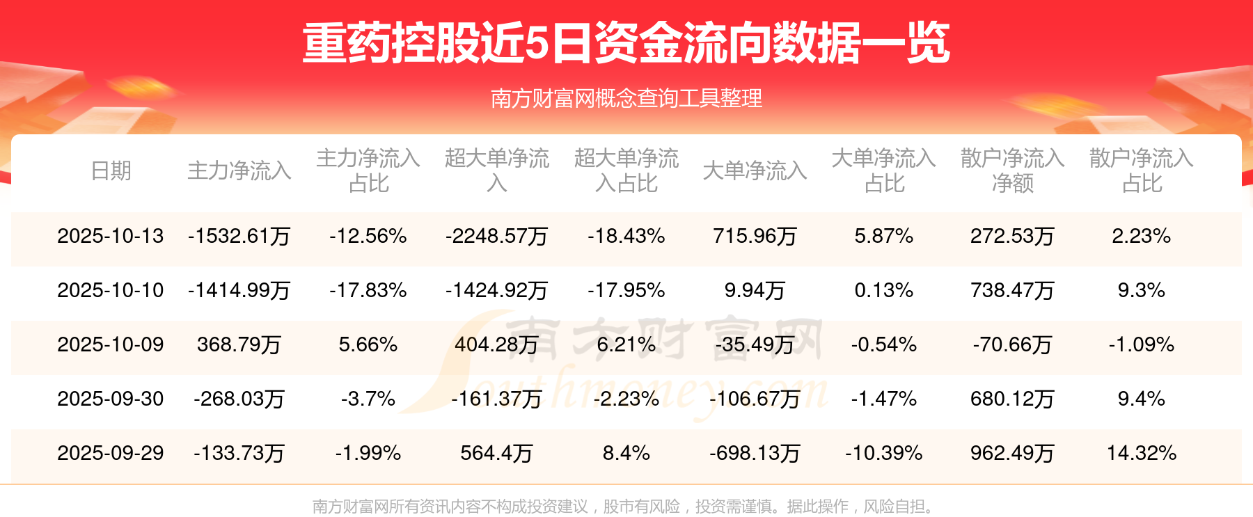 10月13日消息,重药控股资金净流出1532.61万元,超大单资金净流出2248.57万元,换手率1.37%,成交金额1.22亿元。