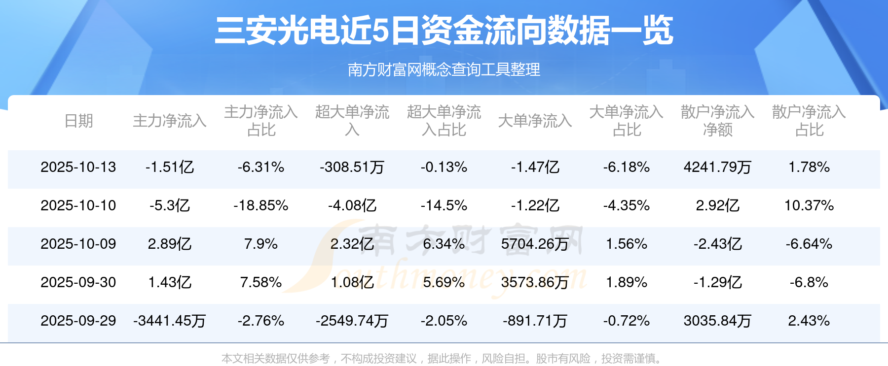 10月13日该股主力资金净流出1.51亿元,超大单资金净流出308.51万元,大单资金净流出1.47亿元,中单资金净流入1.08亿元,散户资金净流入4241.79万元。