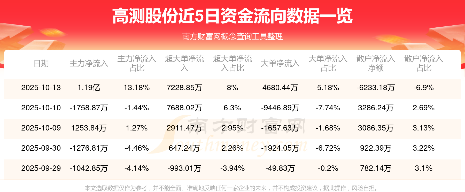 10月13日消息,高测股份资金净流入1.19亿元,超大单资金净流入7228.85万元,换手率9.26%,成交金额9.04亿元。