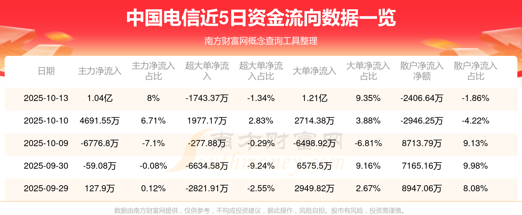 10月13日消息,中国电信10月13日主力资金净流入1.04亿元,超大单资金净流出1743.37万元,大单资金净流入1.21亿元,散户资金净流出2406.64万元。