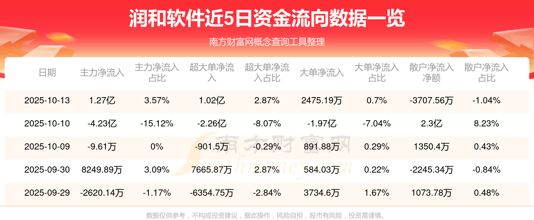10月13日消息,润和软件主力资金净流入1.27亿元,超大单资金净流入1.02亿元,散户资金净流出3707.56万元。