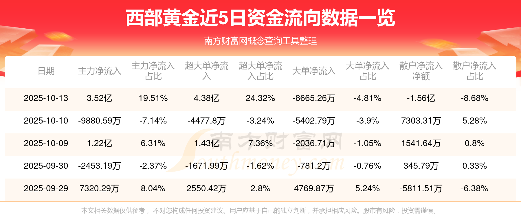 10月13日消息,西部黄金10月13日主力资金净流入3.52亿元,超大单资金净流入4.38亿元,大单资金净流出8665.26万元,散户资金净流出1.56亿元。