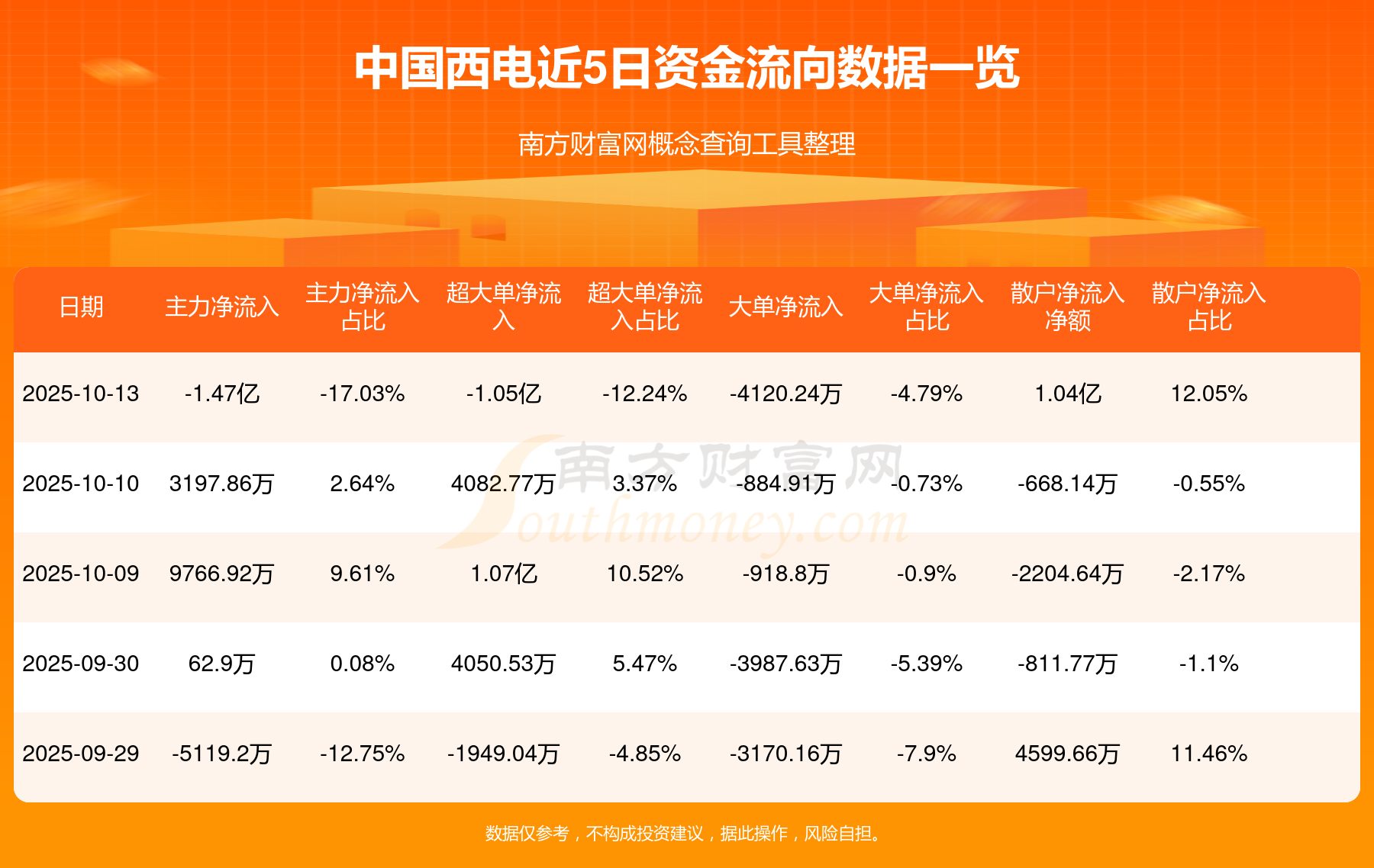 10月13日消息,中国西电主力资金净流出1.47亿元,超大单资金净流出1.05亿元,散户资金净流入1.04亿元。