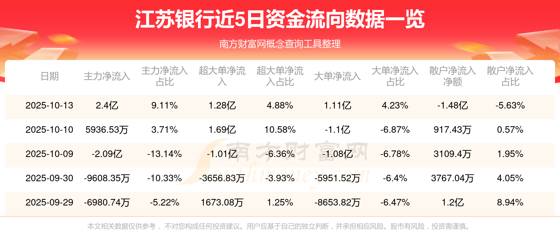 10月13日消息,江苏银行主力净流入2.4亿元,超大单净流入1.28亿元,散户净流出1.48亿元。