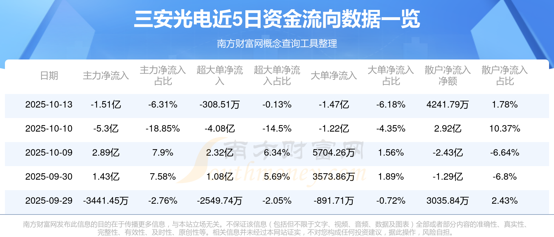 10月13日消息,三安光电主力净流出1.51亿元,超大单净流出308.51万元,散户净流入4241.79万元。
