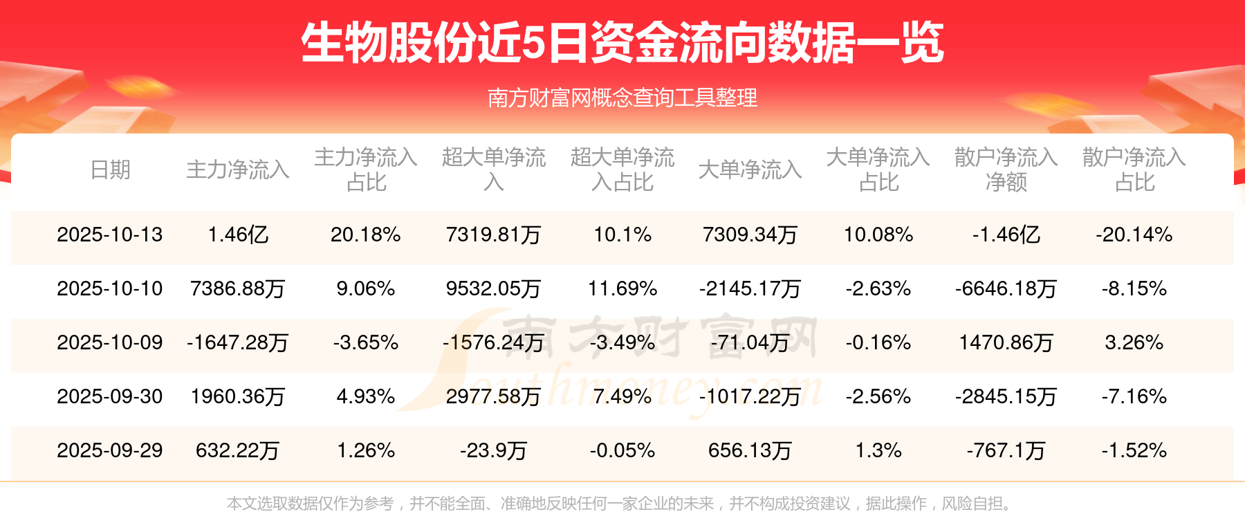 10月13日消息,生物股份主力净流入1.46亿元,超大单净流入7319.81万元,散户净流出1.46亿元。