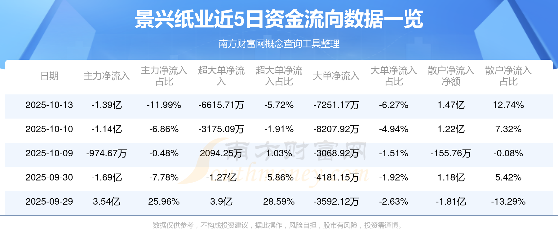 10月13日消息,景兴纸业主力净流出1.39亿元,超大单净流出6615.71万元,散户净流入1.47亿元。