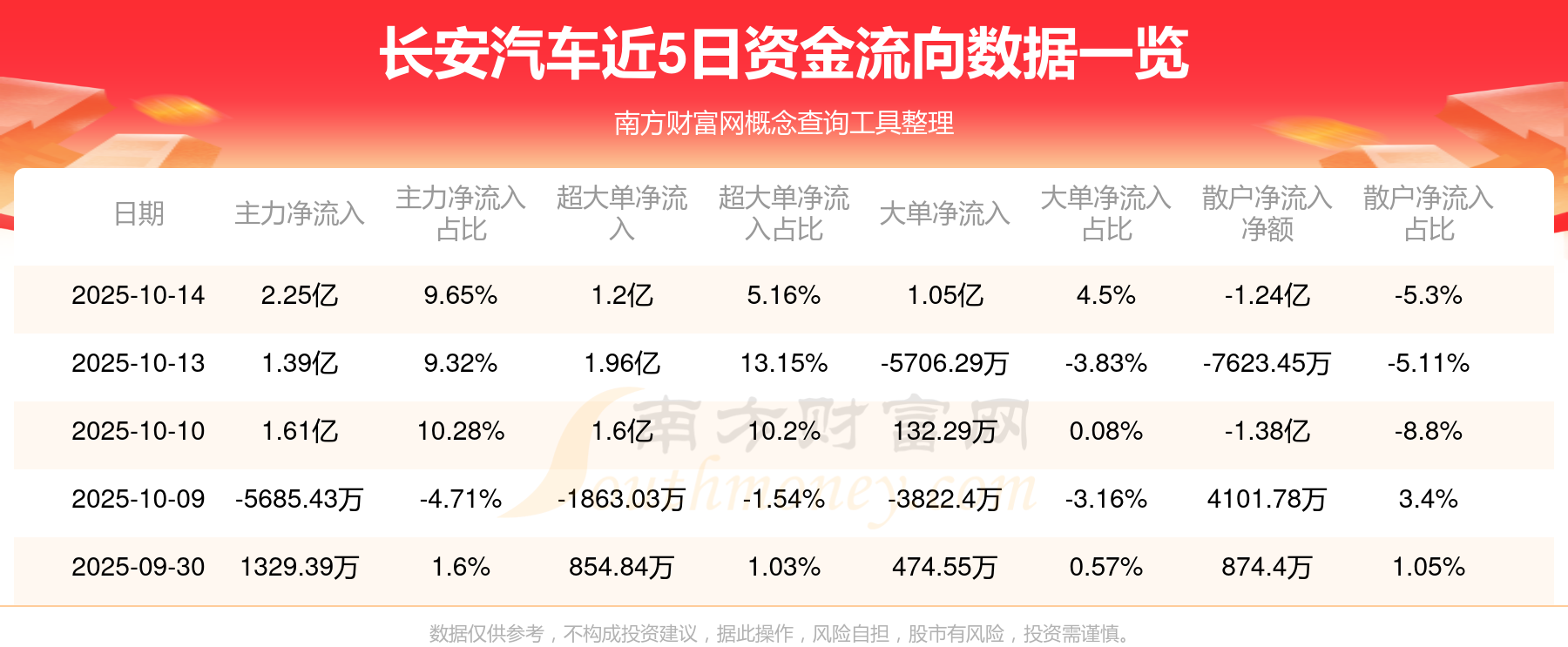 10月14日消息,长安汽车资金净流入2.25亿元,超大单资金净流入1.2亿元,换手率2.23%,成交金额23.3亿元。