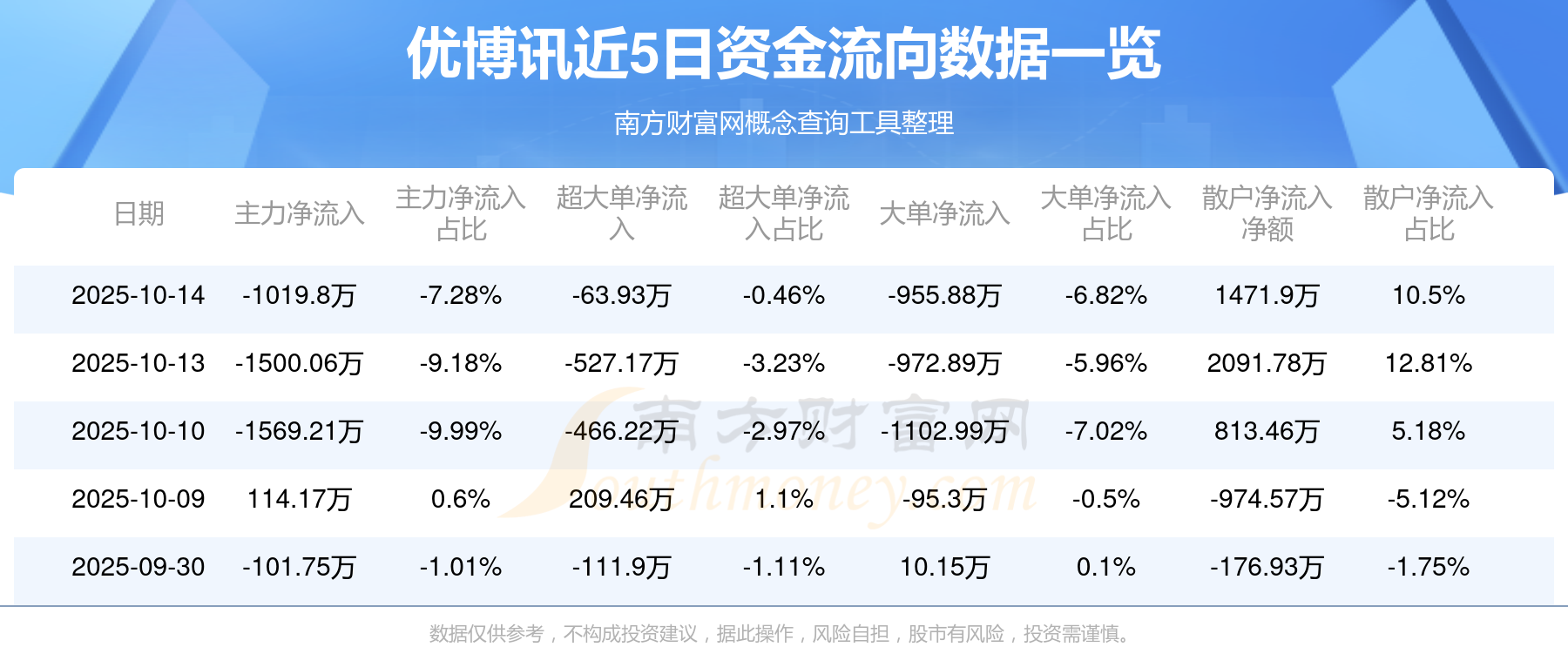 10月14日消息,优博讯资金净流出1019.8万元,超大单资金净流出63.93万元,换手率2.49%,成交金额1.4亿元。