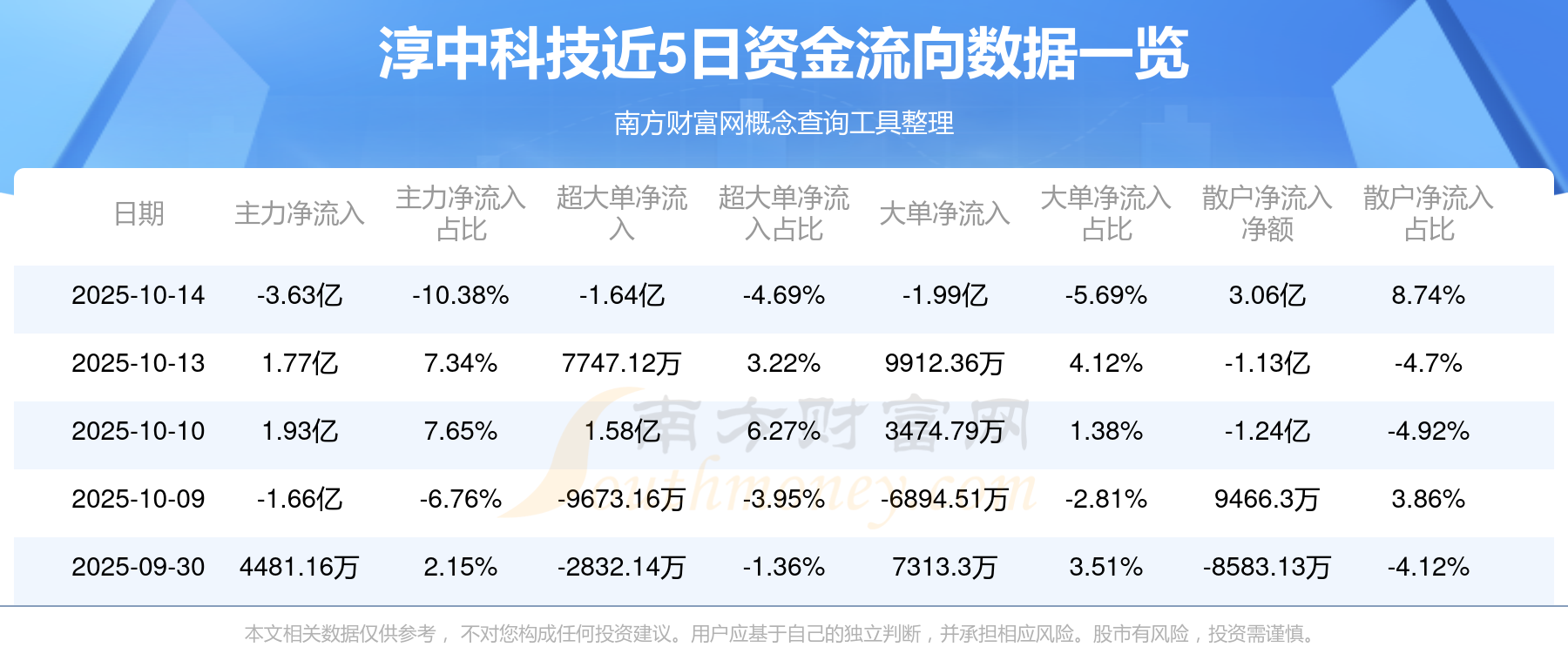 10月14日消息,淳中科技10月14日主力资金净流出3.63亿元,超大单资金净流出1.64亿元,大单资金净流出1.99亿元,散户资金净流入3.06亿元。