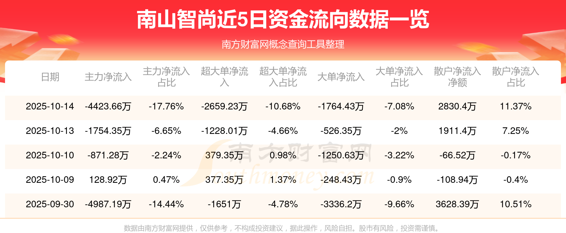 根据数据显示,南山智尚股票在10月13日下午三点收盘跌6%,报价为20.220元。当日成交额达到2.49亿元,换手率2.76%,总市值为102.34亿元。