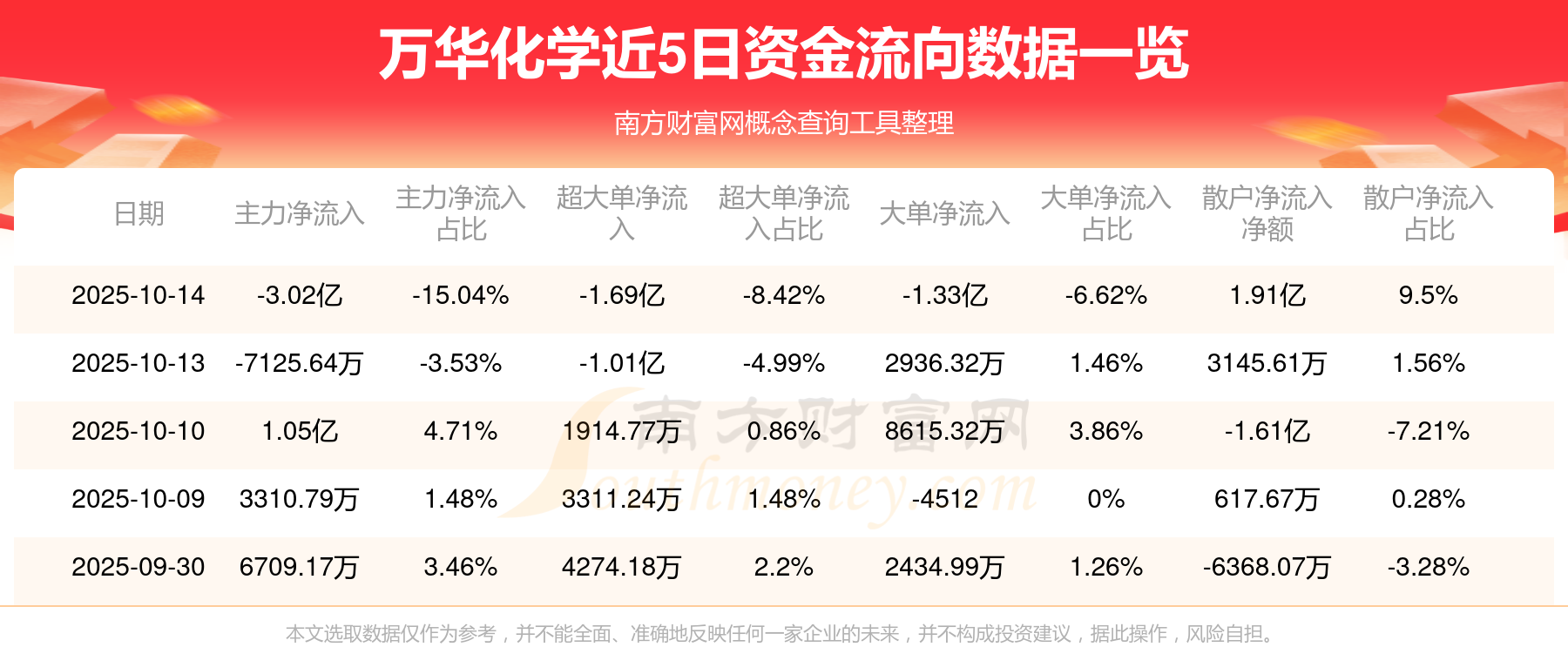 10月14日消息,万华化学资金净流出3.02亿元,超大单资金净流出1.69亿元,换手率0.98%,成交金额20.11亿元。