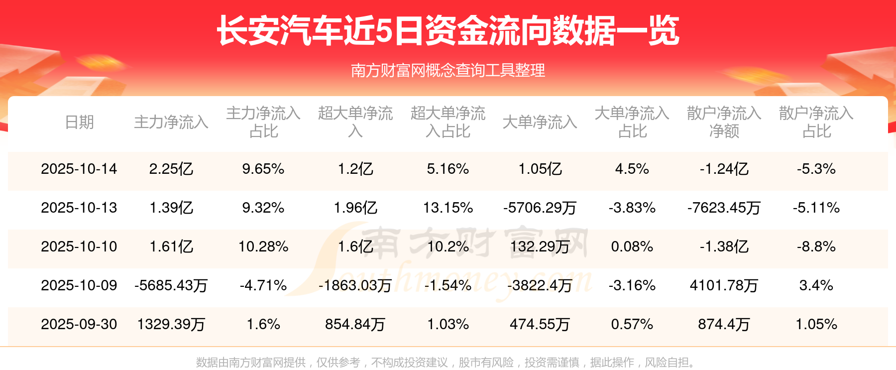10月14日消息,长安汽车10月14日主力净流入2.25亿元,超大单净流入1.2亿元,大单净流入1.05亿元,散户净流出1.24亿元。