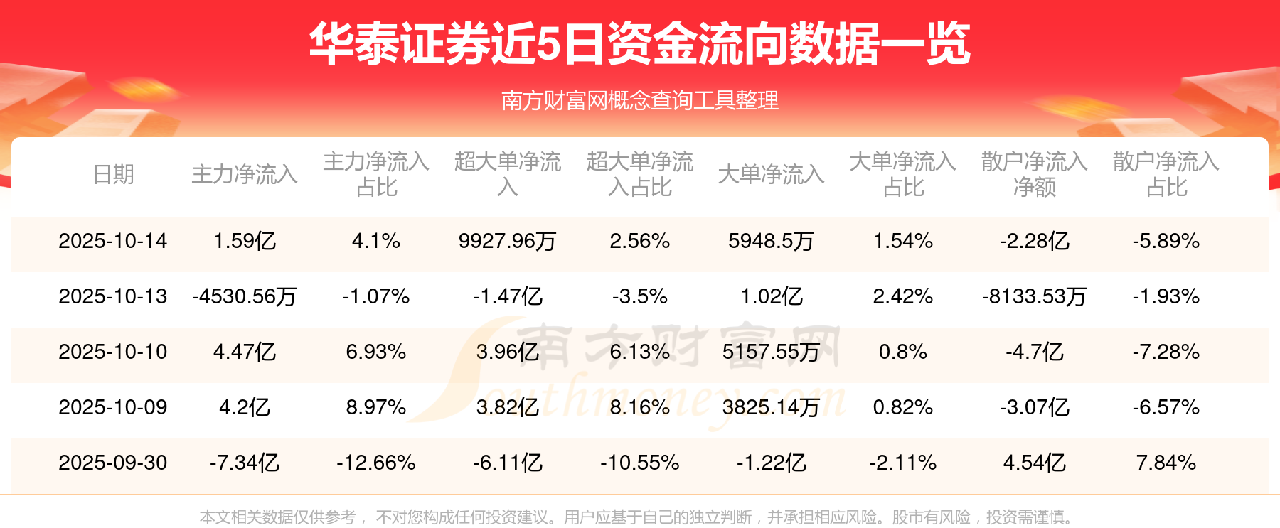 10月14日消息,华泰证券10月14日主力净流入1.59亿元,超大单净流入9927.96万元,大单净流入5948.5万元,散户净流出2.28亿元。