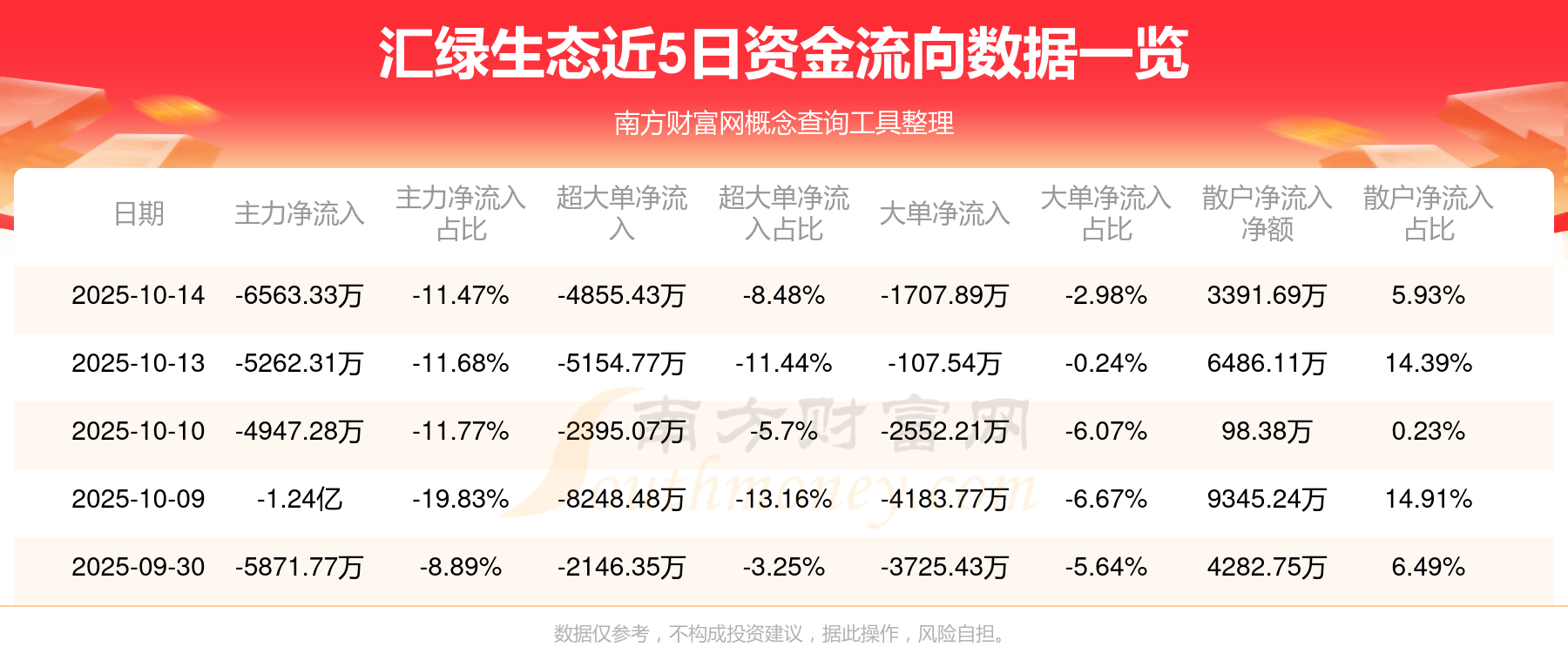 10月14日消息,汇绿生态主力资金净流出6563.33万元,超大单资金净流出4855.43万元,散户资金净流入3391.69万元。