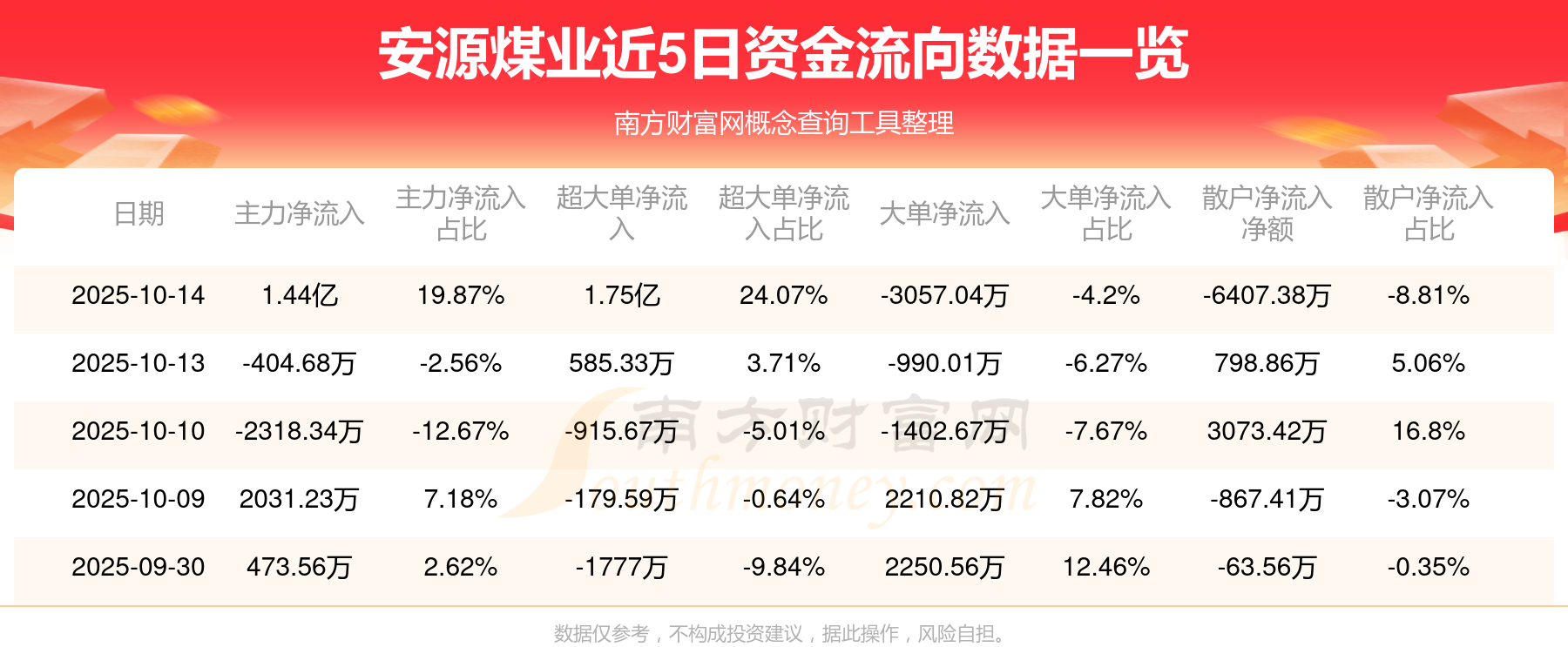 10月14日消息,安源煤业主力资金净流入1.44亿元,超大单资金净流入1.75亿元,散户资金净流出6407.38万元。
