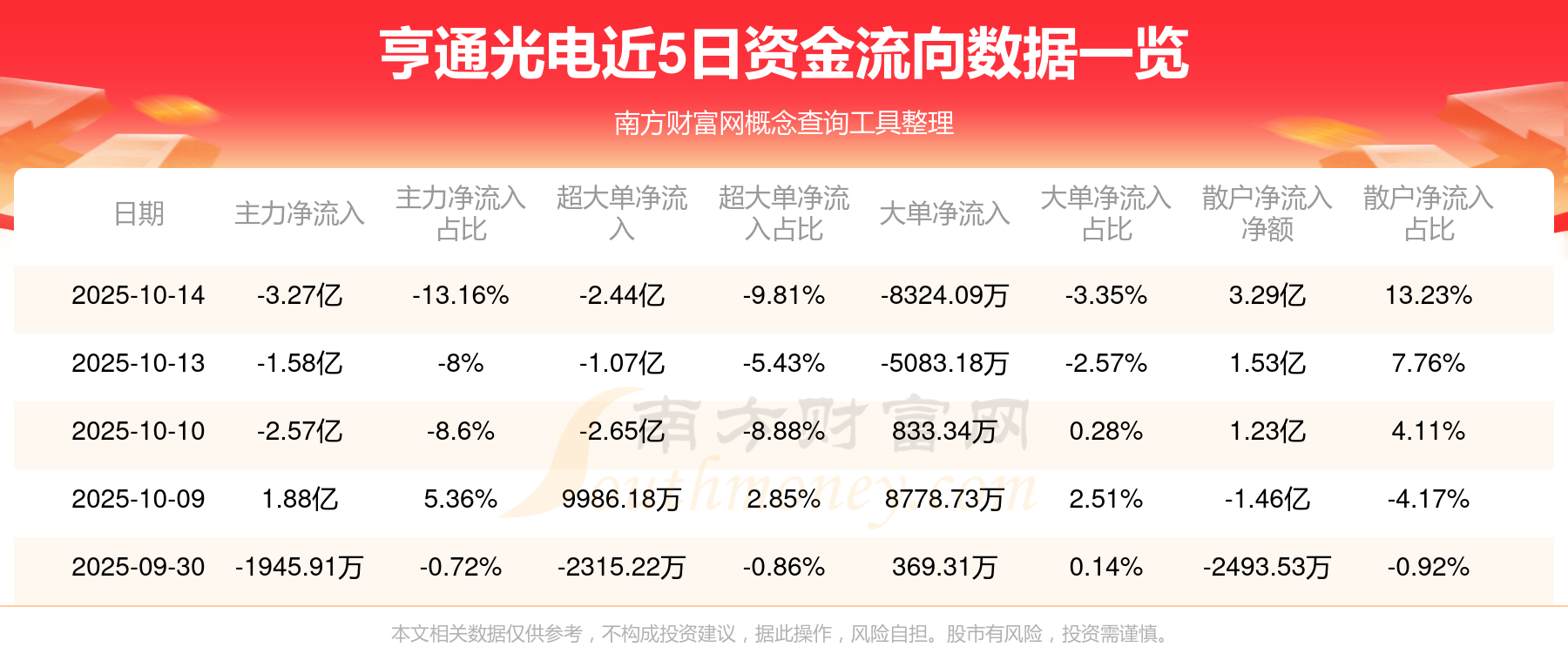 10月14日消息,亨通光电10月14日主力资金净流出3.27亿元,超大单资金净流出2.44亿元,大单资金净流出8324.09万元,散户资金净流入3.29亿元。