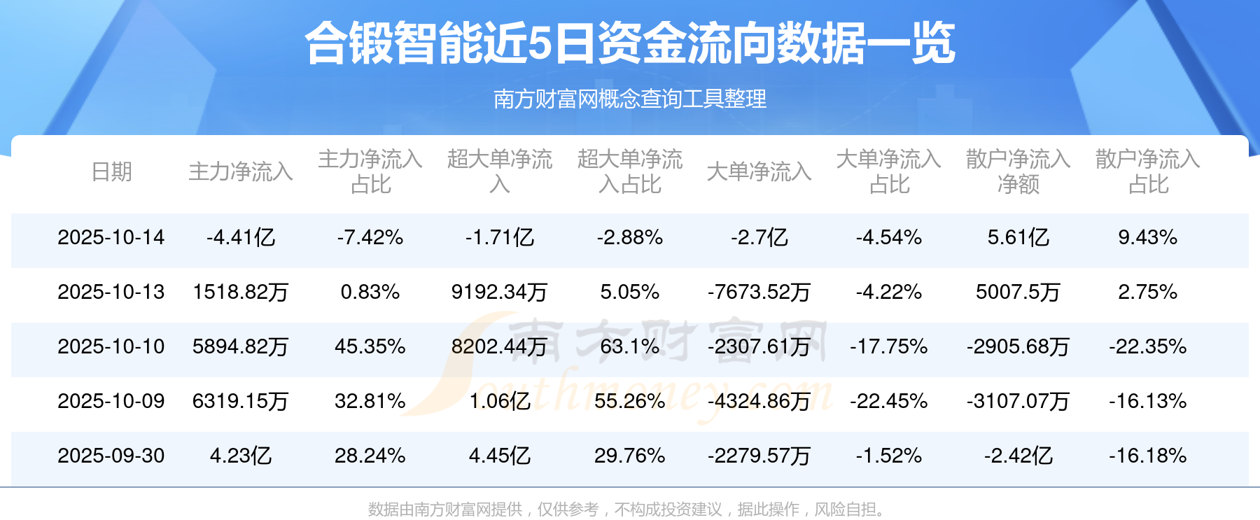 10月14日消息,合锻智能10月14日主力净流出4.41亿元,超大单净流出1.71亿元,大单净流出2.7亿元,散户净流入5.61亿元。