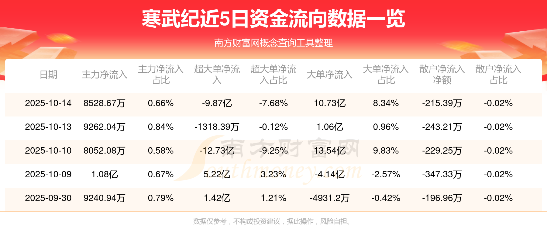 10月14日消息,寒武纪-U主力净流入8528.67万元,超大单净流出9.87亿元,散户净流出215.39万元。