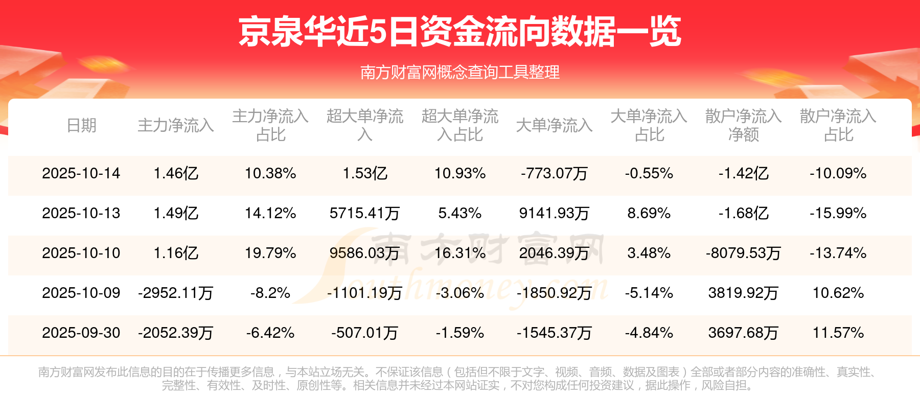 10月14日消息,京泉华资金净流入1.46亿元,超大单资金净流入1.53亿元,换手率27.31%,成交金额14.04亿元。