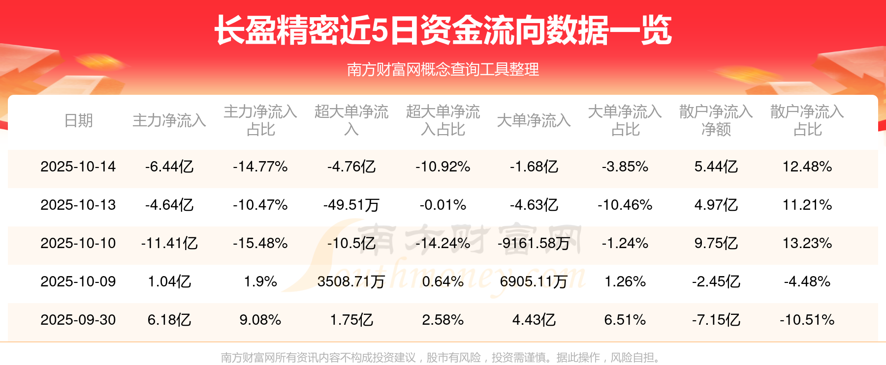 10月14日消息,长盈精密10月14日主力净流出6.44亿元,超大单净流出4.76亿元,大单净流出1.68亿元,散户净流入5.44亿元。