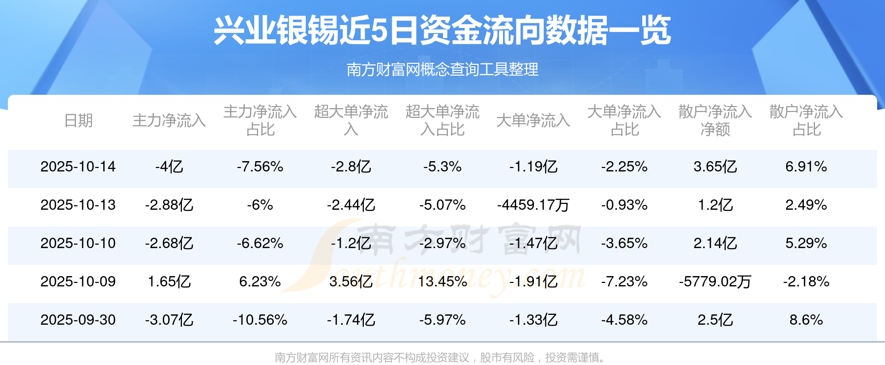 10月14日消息,兴业银锡资金净流出4亿元,超大单资金净流出2.8亿元,换手率8.06%,成交金额52.88亿元。