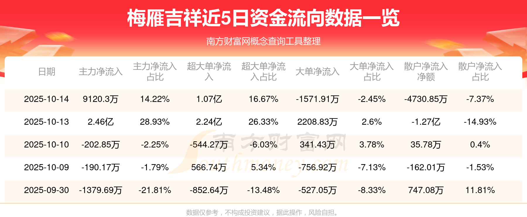 10月14日消息,梅雁吉祥资金净流入9120.3万元,超大单资金净流入1.07亿元,换手率10.22%,成交金额6.42亿元。