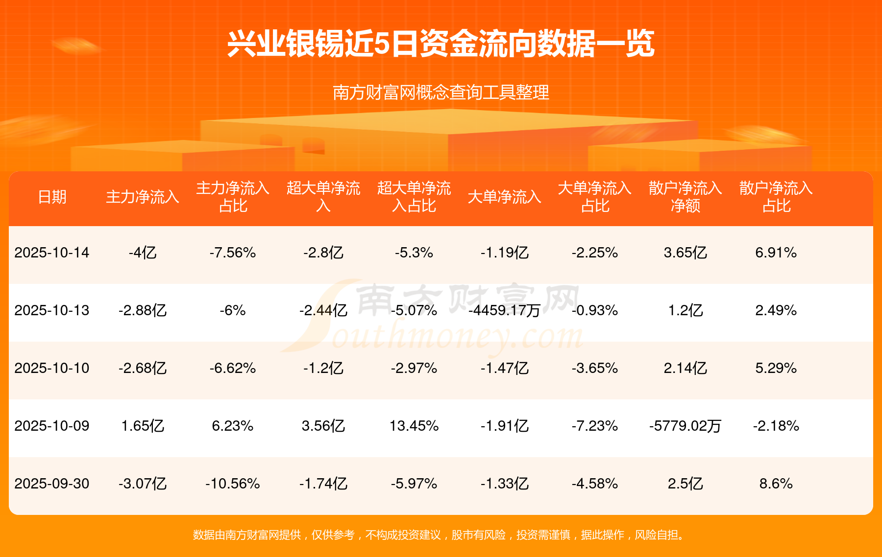 10月14日消息,兴业银锡10月14日主力净流出4亿元,超大单净流出2.8亿元,大单净流出1.19亿元,散户净流入3.65亿元。