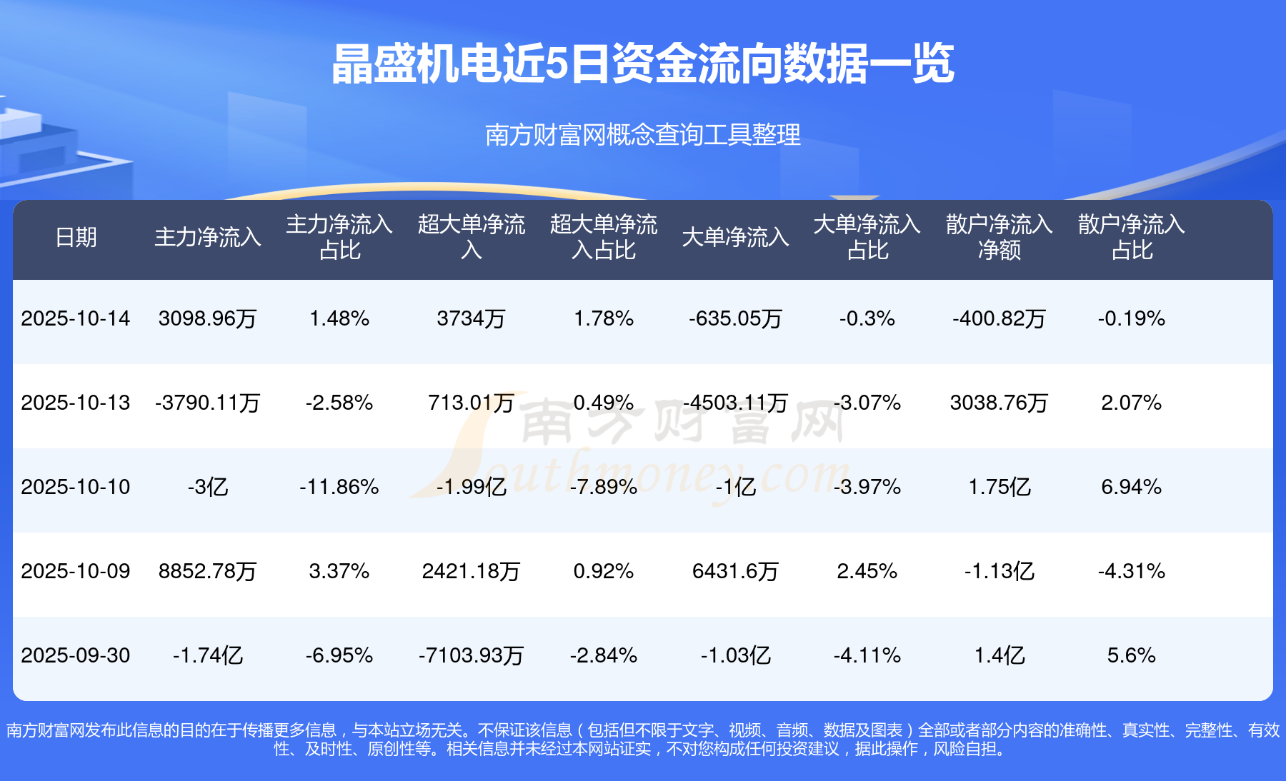 10月14日消息,晶盛机电主力资金净流入3098.96万元,超大单资金净流入3734万元,散户资金净流出400.82万元。