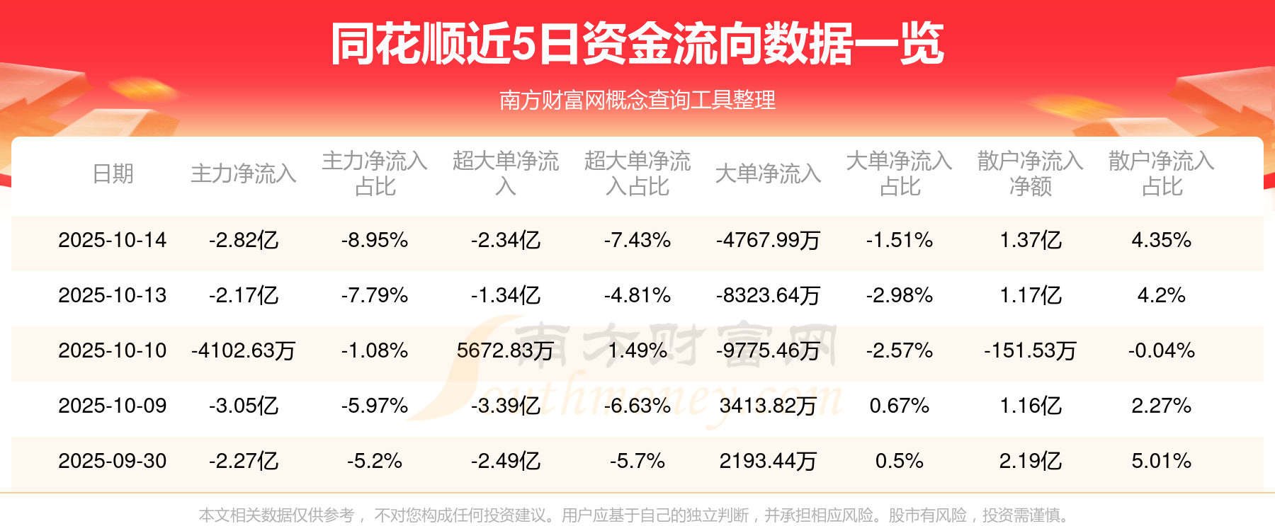 10月14日消息,同花顺10月14日主力资金净流出2.82亿元,超大单资金净流出2.34亿元,大单资金净流出4767.99万元,散户资金净流入1.37亿元。