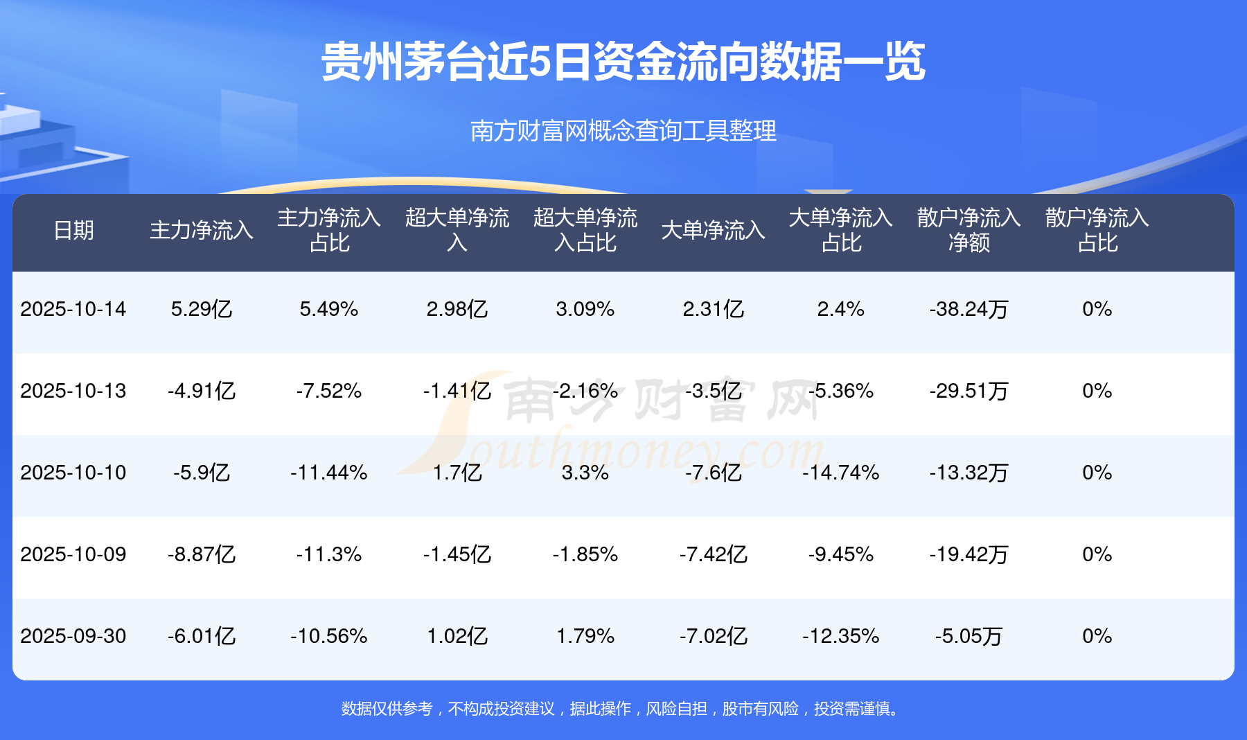 10月14日消息,贵州茅台主力资金净流入5.29亿元,超大单资金净流入2.98亿元,散户资金净流出38.24万元。