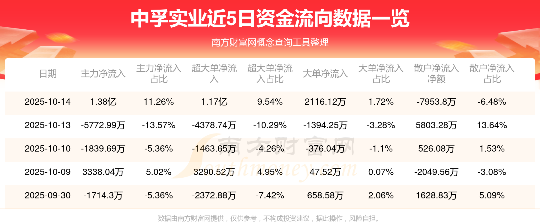 10月14日消息,中孚实业10月14日主力资金净流入1.38亿元,超大单资金净流入1.17亿元,大单资金净流入2116.12万元,散户资金净流出7953.8万元。