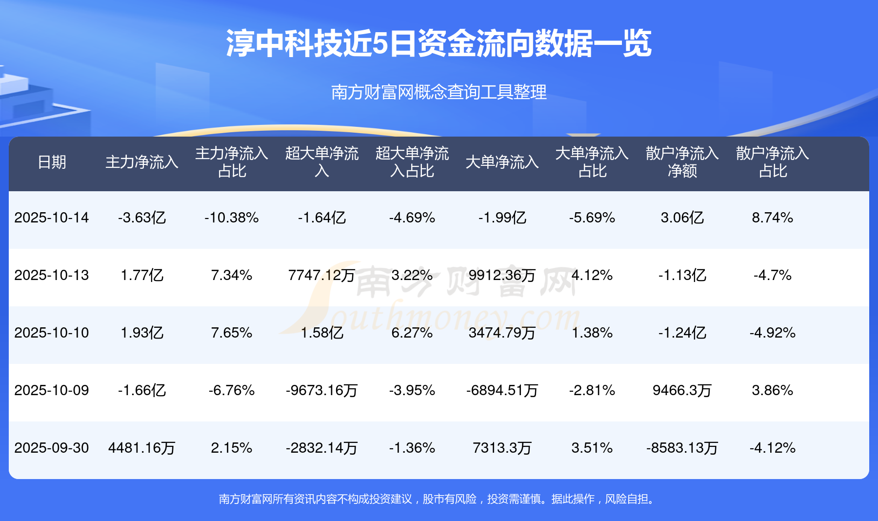 资金流向数据方面,10月14日主力资金净流流出3.63亿元,超大单资金净流出1.64亿元,大单资金净流出1.99亿元,散户资金净流入3.06亿元。