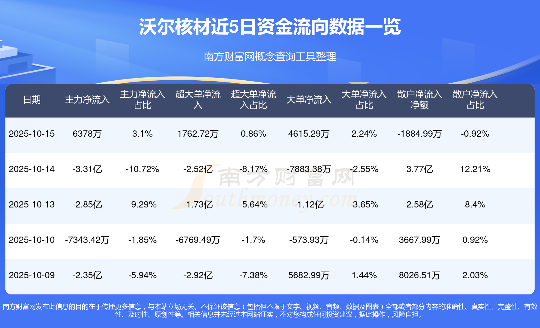 10月15日消息,沃尔核材资金净流入6378万元,超大单净流入1762.72万元,换手率6.39%,成交金额20.58亿元。