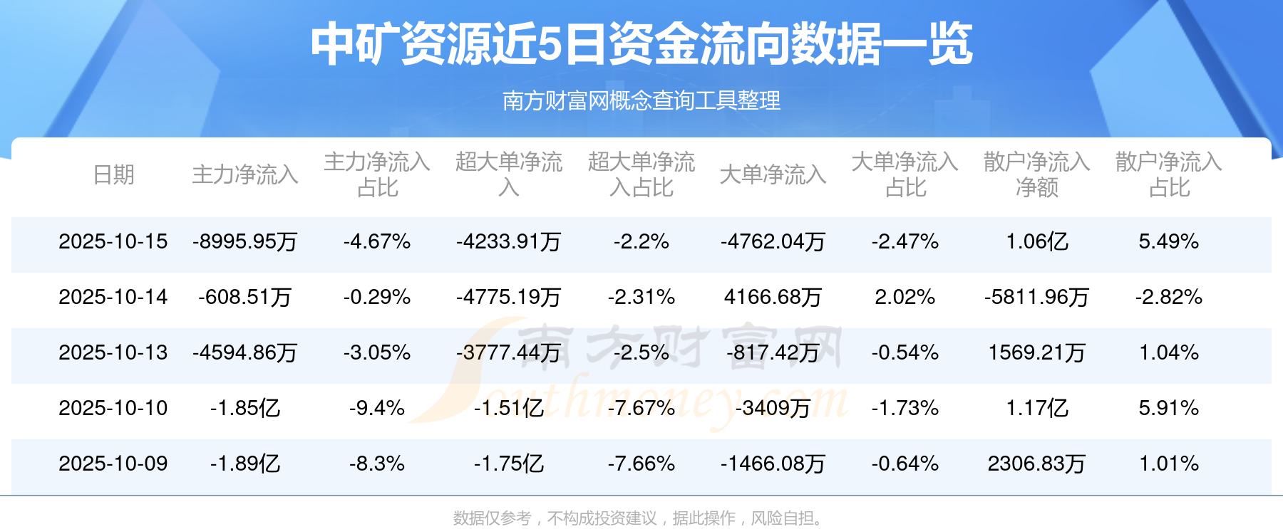 10月15日消息,中矿资源10月15日主力净流出8995.95万元,超大单净流出4233.91万元,大单净流出4762.04万元,散户净流入1.06亿元。