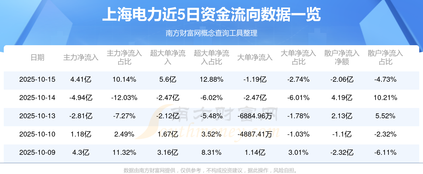 10月15日消息,上海电力10月15日主力净流入4.41亿元,超大单净流入5.6亿元,大单净流出1.19亿元,散户净流出2.06亿元。