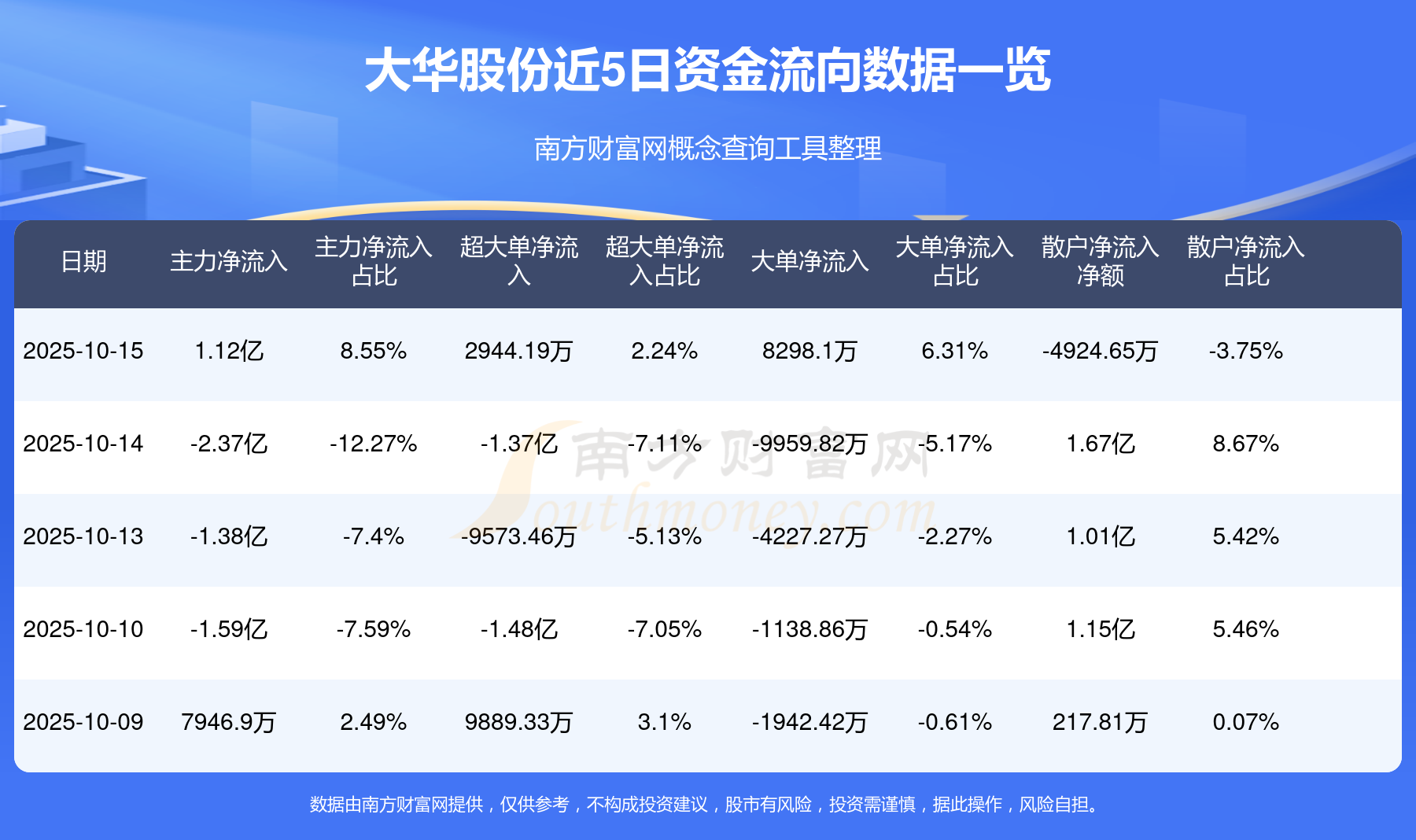 10月15日消息,大华股份10月15日主力净流入1.12亿元,超大单净流入2944.19万元,大单净流入8298.1万元,散户净流出4924.65万元。