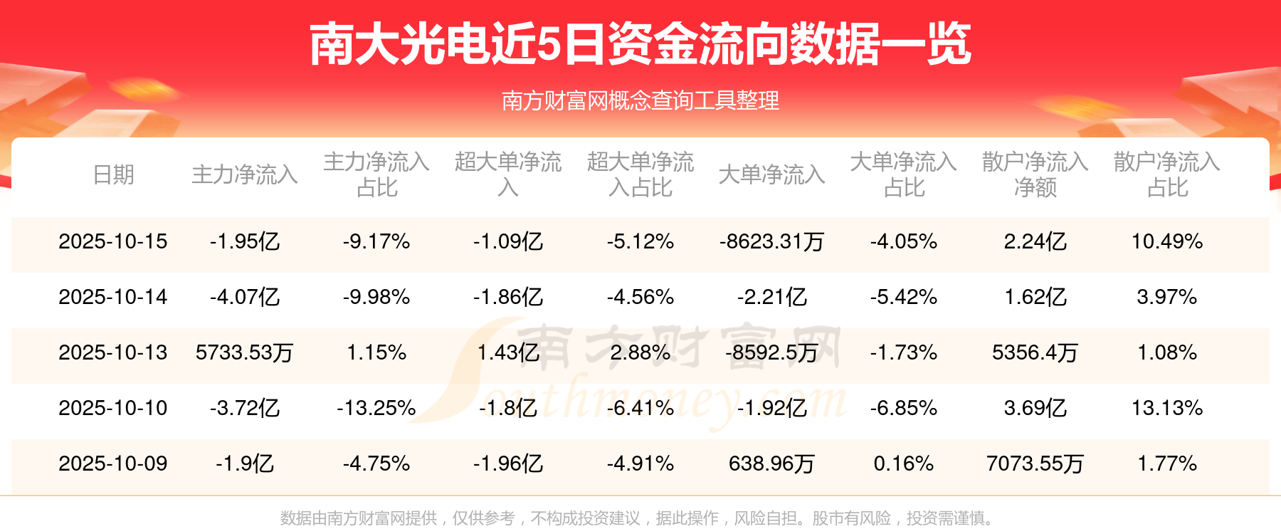 10月15日消息,南大光电资金净流出1.95亿元,超大单资金净流出1.09亿元,换手率8%,成交金额21.3亿元。