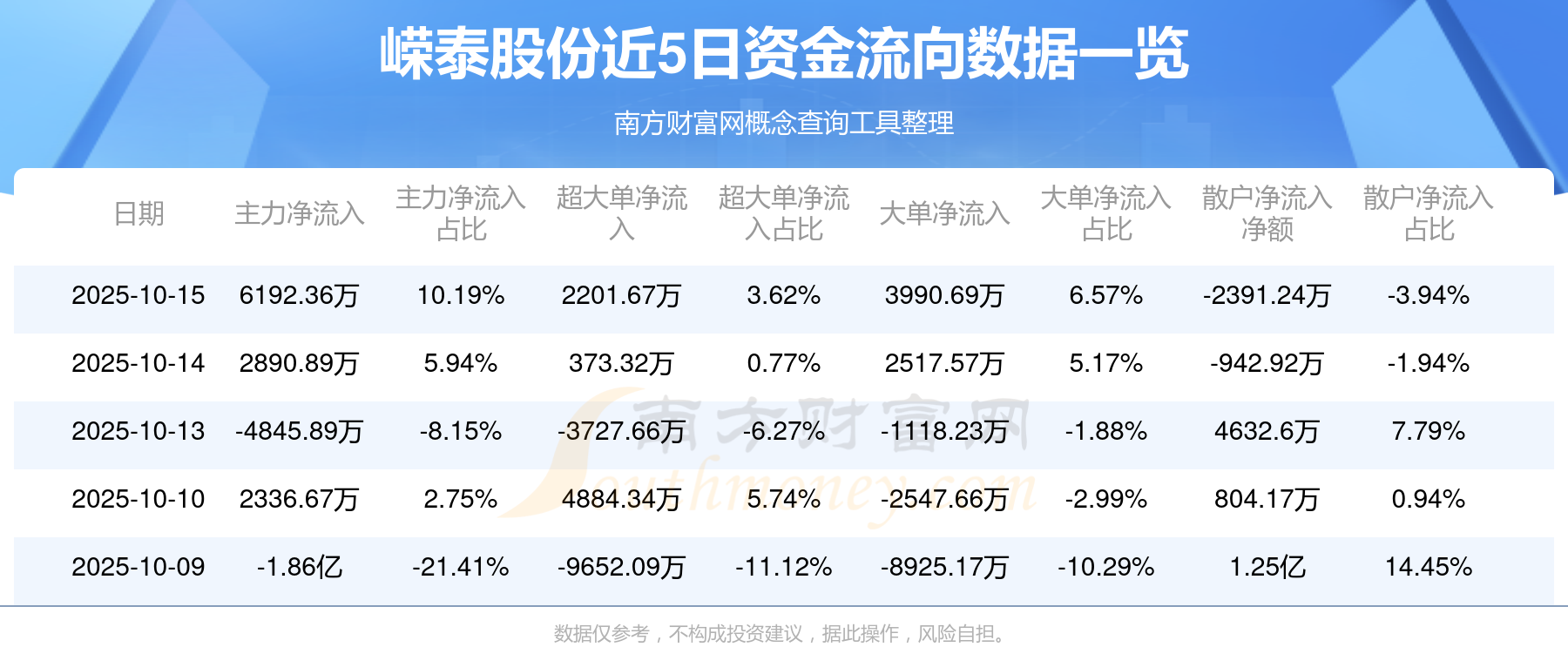 10月15日消息,嵘泰股份10月15日主力净流入6192.36万元,超大单净流入2201.67万元,大单净流入3990.69万元,散户净流出2391.24万元。