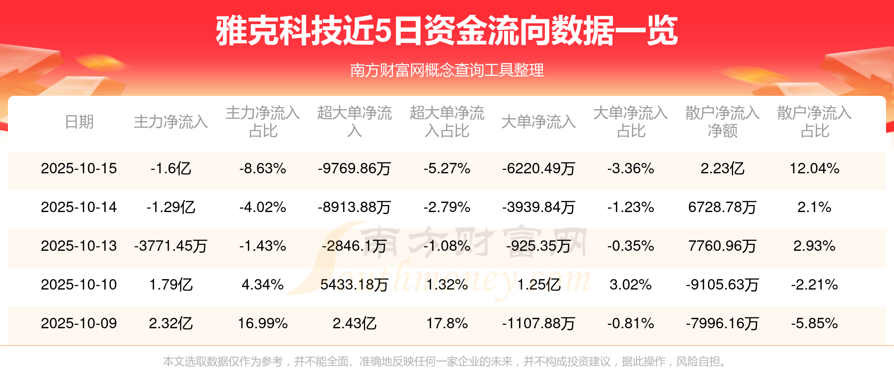 10月15日消息,雅克科技资金净流出1.6亿元,超大单资金净流出9769.86万元,换手率7.77%,成交金额18.54亿元。