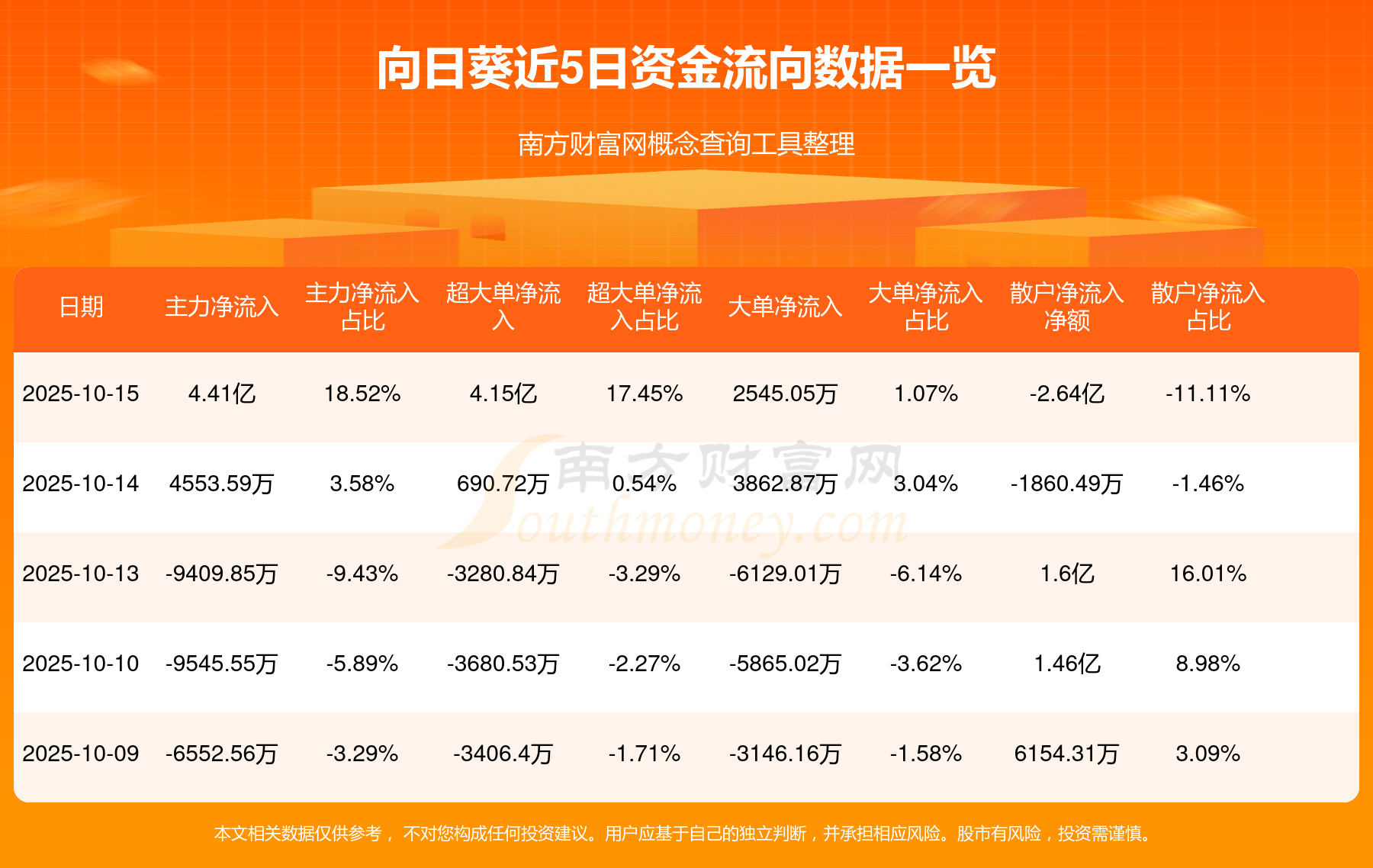 10月15日消息,向日葵主力净流入4.41亿元,超大单净流入4.15亿元,散户净流出2.64亿元。