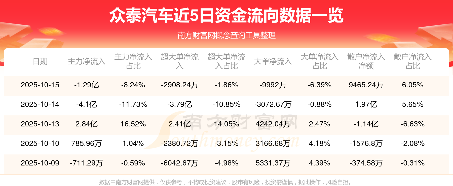 10月15日消息,众泰汽车资金净流出1.29亿元,超大单净流出2908.24万元,换手率8.87%,成交金额15.65亿元。