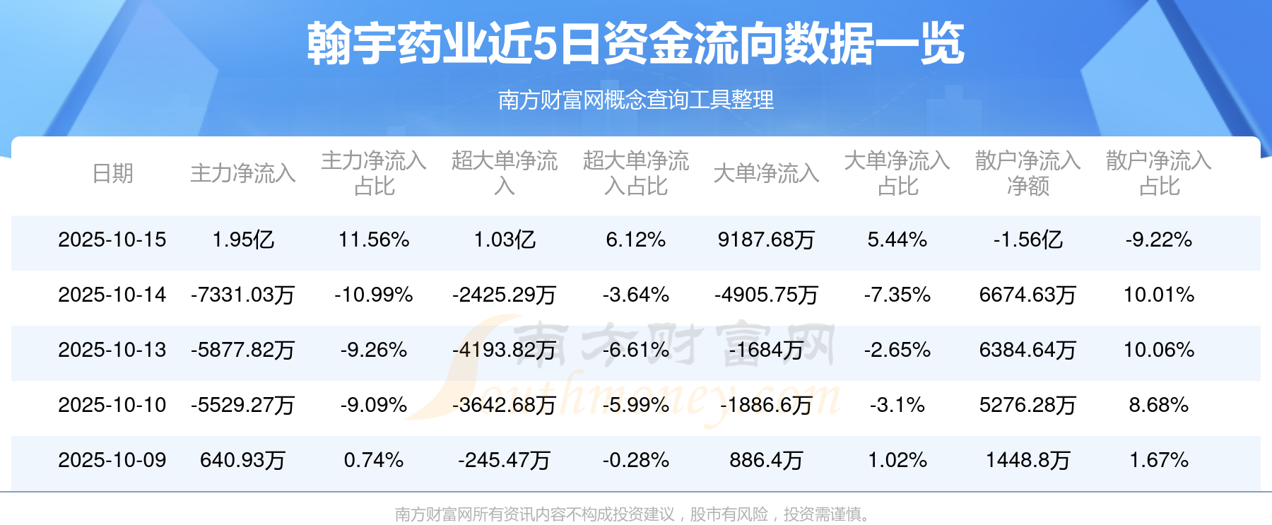 10月15日消息,翰宇药业主力净流入1.95亿元,超大单净流入1.03亿元,散户净流出1.56亿元。