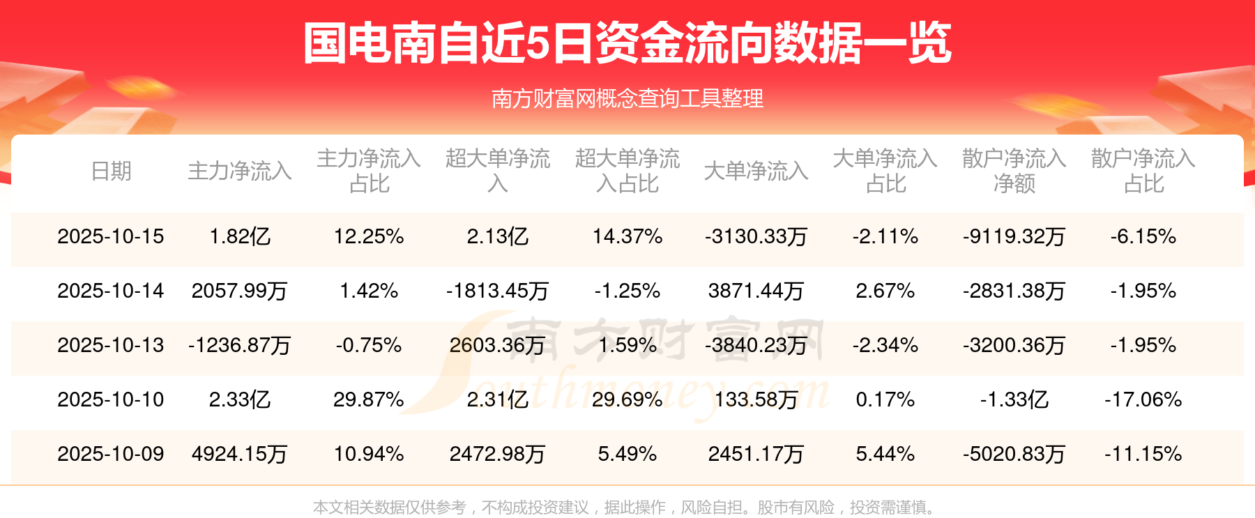 10月15日消息,国电南自主力资金净流入1.82亿元,超大单资金净流入2.13亿元,散户资金净流出9119.32万元。