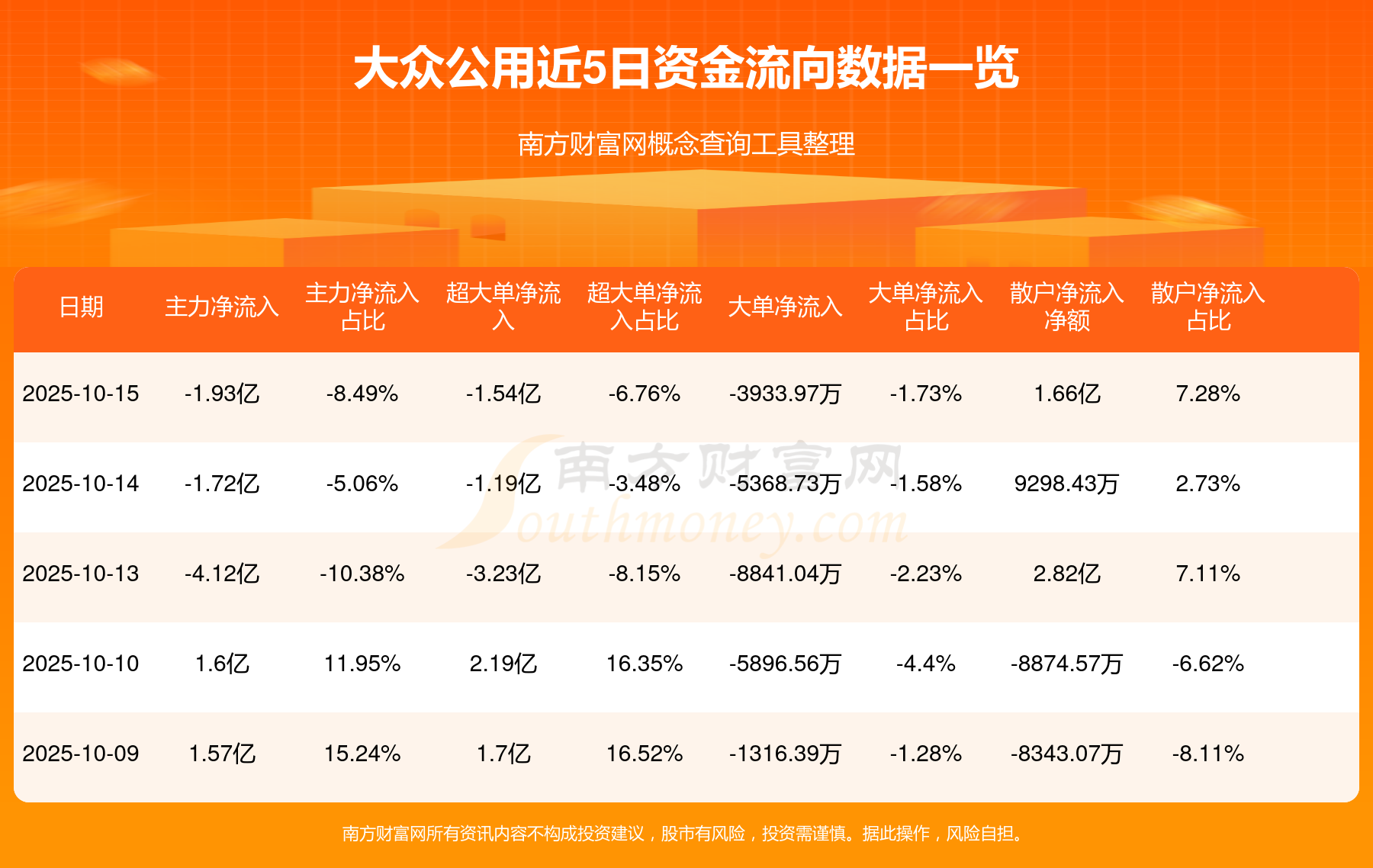 10月15日消息,大众公用资金净流出1.93亿元,超大单资金净流出1.54亿元,换手率13.93%,成交金额22.77亿元。